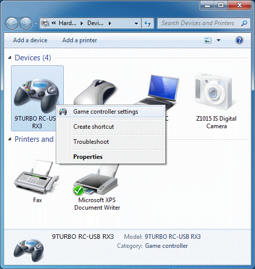![]() Right click at 9TURBO RC-USB RX3 icon then click at "Game Controller Settings". |