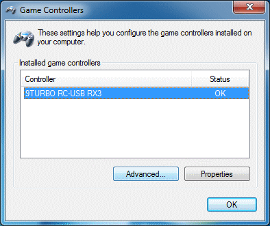 ![]() return to Game Controller window, select 9TURBO RC-USB RX3. click at "Properties" button. |